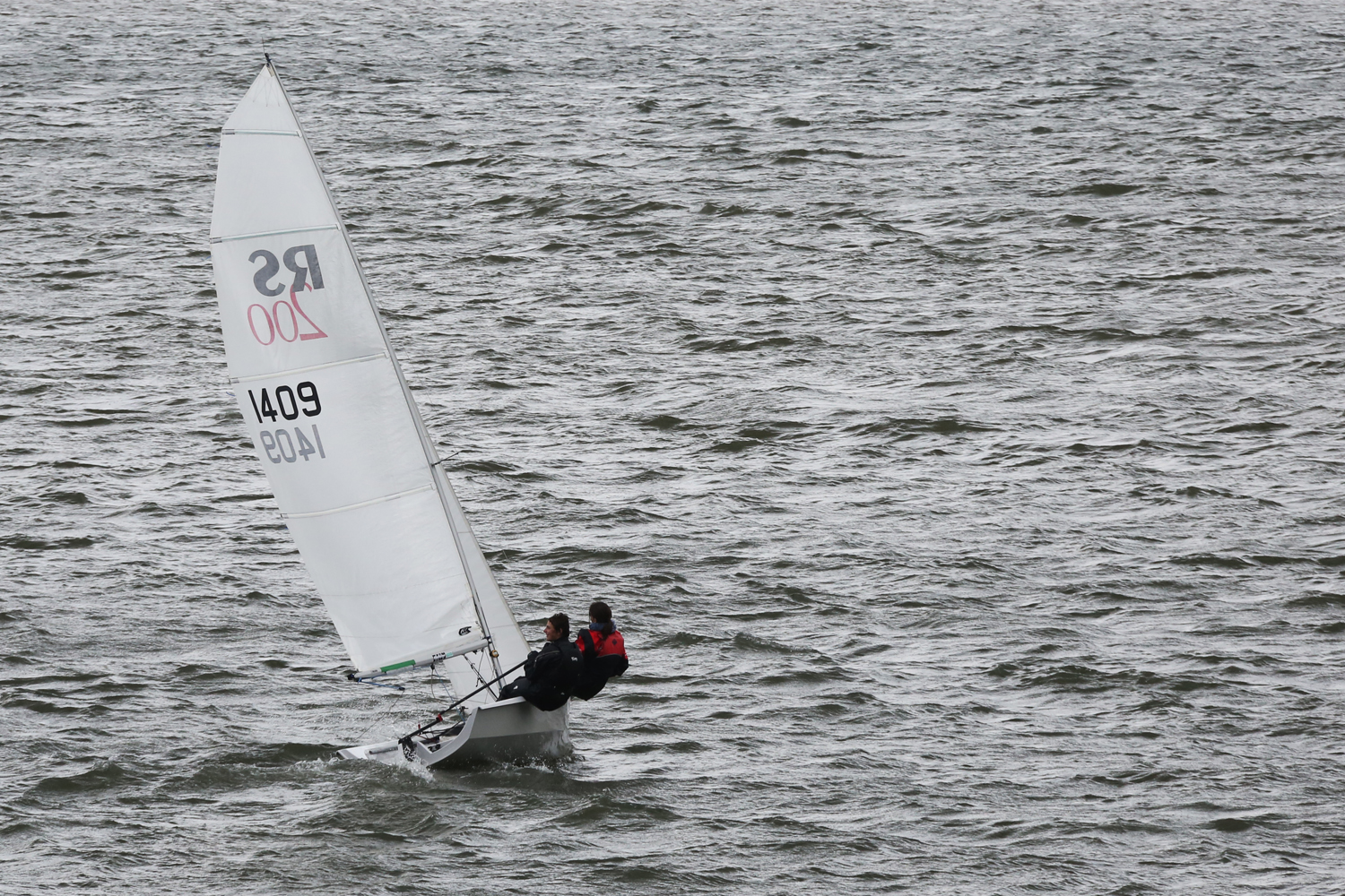 With everything set, the forecast being 15 -18 kts with an expected increase later in the day, there was no time to lose. White & Green were first off, a clean start and 3 minutes later blue & purple were away. The idea being to avoid large numbers at markroundings and therefore lessening the possibility of damage or injuries. On lap 1, boat 1467( Chris Catt / Ally Martin) was getting away over 831 (Thomas Wright / Lottie Clay) in the first flight were leading and in the Second Flight 962 (Andrew Peters / Jill Peters ) were leading on 634 (Dave Jessop / Renata Sapazinskaite ) However by the end of the race it was 1467 taking the bullet over 1285 (John Teague / Naomi Pound) and the team of Peters maintained their lead but Dave Jessop was overtaken by Eddie Whitehead. Races were scheduled for 35 to 40 Minutes, back to back. R/O John Smalley was quick off the mark with race two, no delays and now it’s white against blue and green against purple. First lap leaders in their respective flights were 1467 Chris Catt over 1311 (Matt Mee / Emma Norris) and 962 (Andrew Peters) over 854 (Andy Shaw / Pippa Horne) at the end of race 2 though it was 1311 taking the bullet from the First flight and 962 maintaining his lead. Another quick turn round and it was green/blue and white/purple. The wind meanwhile had dropped a touch but this was only temporary as a squall came through which flattened a few of the fleet, time for a rest sitting on the hull while it passed, meanwhile the leaders shot into the distance with Matt Mee rounding ahead of 822 (Eddie Whitehead / Toby Lewis) and in the second flight it was 1508 (George Yeoman / Sophie Ormsby) over 1237 (Dicken McClean / Clint Eastwood) at the conclusion it was Matt Mee over Eddie Whitehead and George Yeoman over Chris Catt. So came the end of day 1.