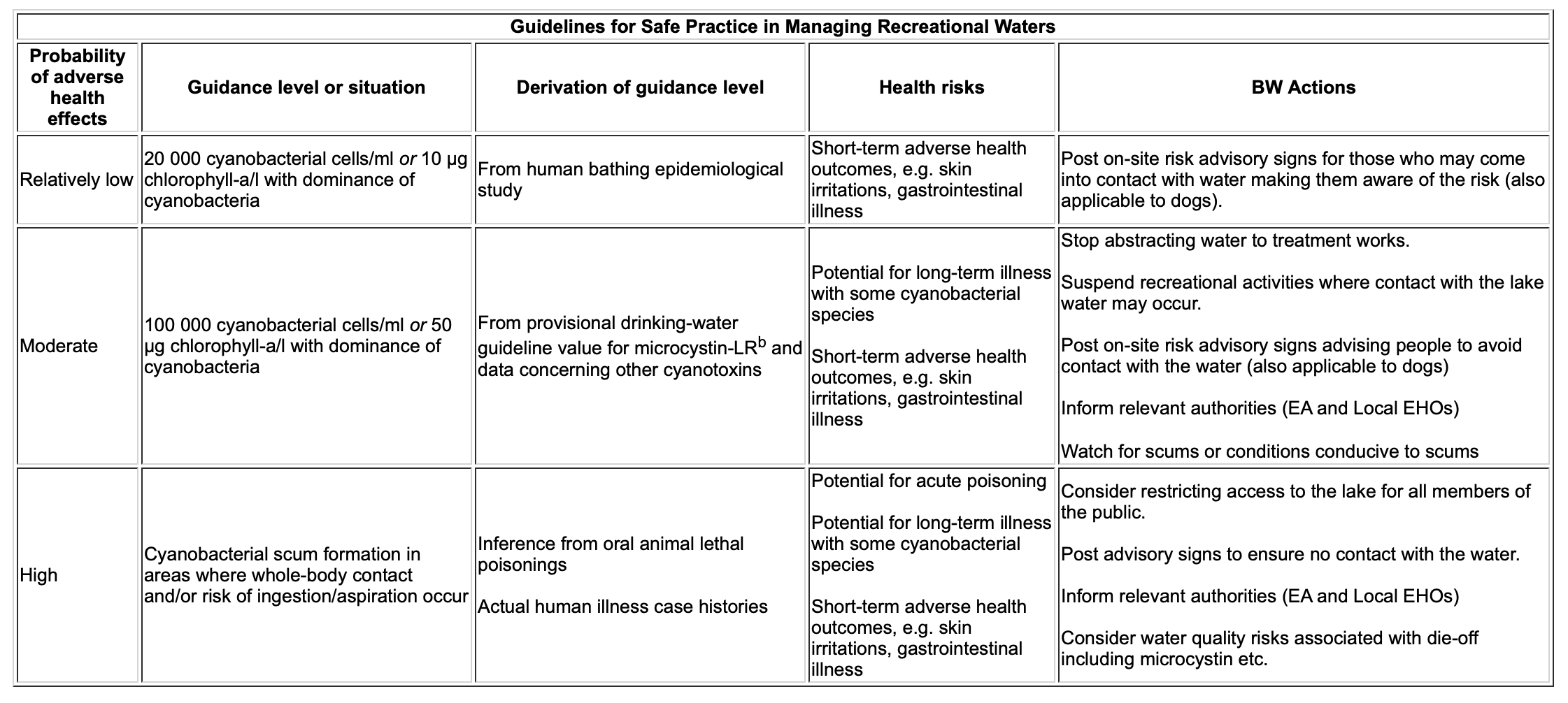 Our current internal guideline values are based on guidance from the world health organisation. [shown in the table below]. We have adopted the precautionary approach to restrict recreational activities that would result in contact with water when counts exceed 100,000 cells/ml in our sample results. The reason for this is that there is a high likelihood of localised scums on parts of the lake where counts will be significantly higher.