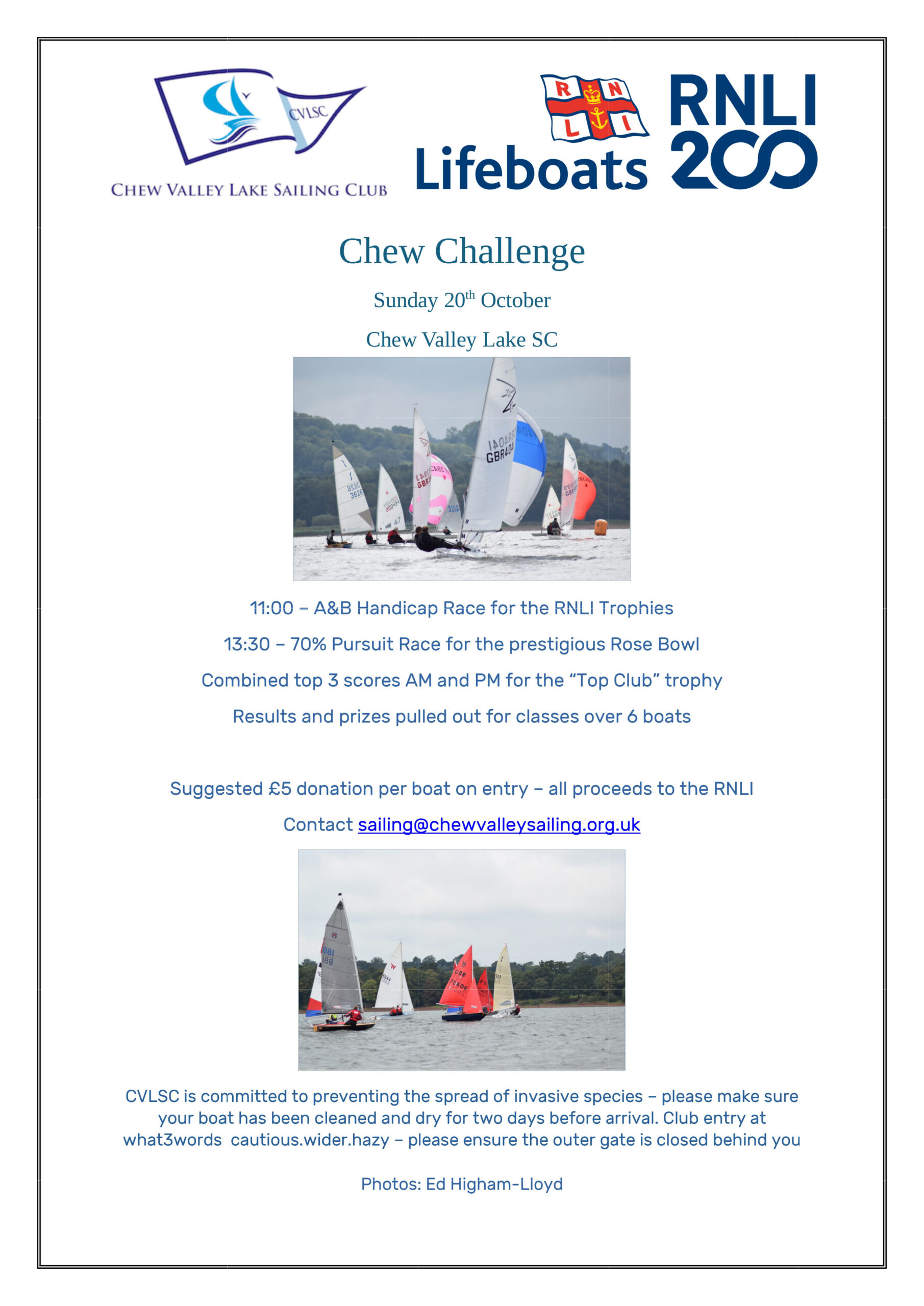 On Sunday 20th October is the next main sailing event for club members – the Chew Challenge. This year is the 200th anniversary of the RNLI and this day is in part to contribute to them helping to do their amazing work. There will be a handicap race in the morning and a 70% pursuit in the afternoon with prizes for A and B Handicap as well as Top Club. We’ll also pull out results and give prizes for any class with more than 6 boats. Please do share the poster below with your class associations or local clubs, it must be the cheapest visitors day around!